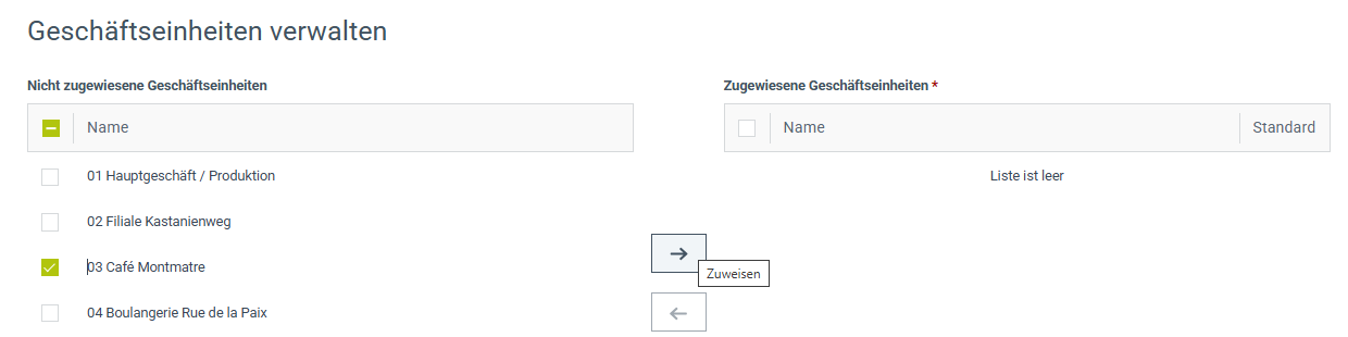 - Weisen Sie mindestens eine Geschäftseinheit zu, indem Sie diese auf der linken Seite auswählen und mittels den rechten Pfeil zuweisen - Sie können auch mehrere gleichzeitig auswählen und hinzufügen.