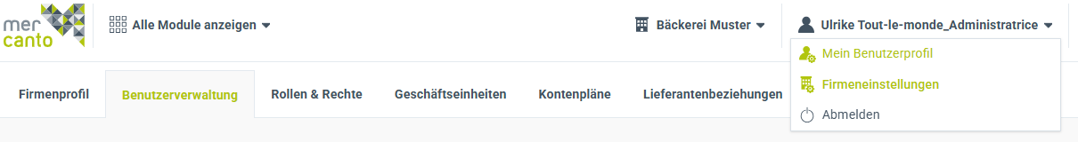 - Klicken Sie oben rechts auf Ihren Namen und wählen Sie "Firmeneinstellungen"